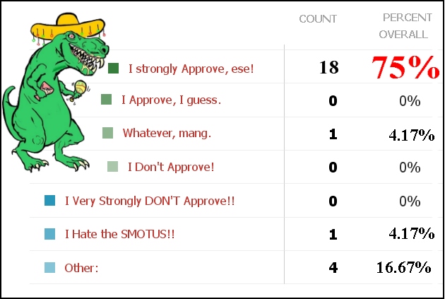 As the chart shows above, the American public largely approves of the SMOTUS, despite historically low taco supplies, and his widely unpopular and capricious Burrito Embargos, and Salsa Sanctions. Independent analysis shows that those unapproving of the SMOTUS are racist.